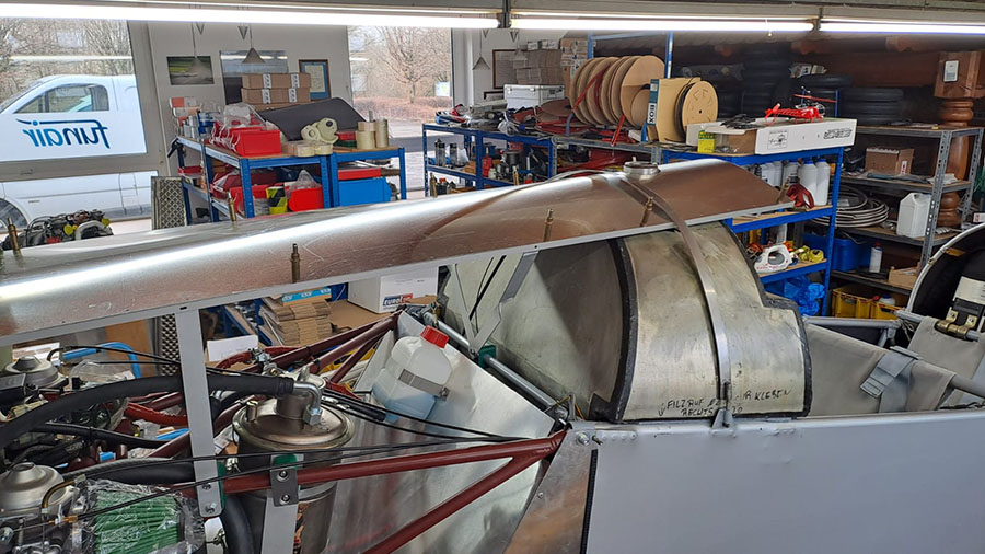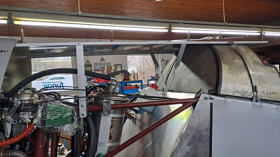 Schon beim bloßen auflegen des langen Blechteils war Sascha wesentlich zufriedener als mit der alten Variante. Und gefühlt wird das nochmals stabiler als bei der ersten Idee. Hier werden jetzt auch weniger Verstrebungen benötigt. Im nächsten Schritt wird jetzt das Blech über dem Tank/Co-Piloten-Cockpit neu geschnitten, sowie eine Alu-Rippe hergestellt, die das Blech mehr in Form bringt.