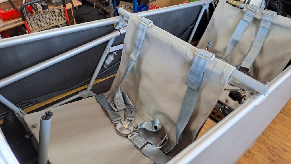 An den Sitzen scheiden sich beim Kiebitz die Geister. In unserem Kiebitz waren die klassischen Stoffsitze verbaut. Es gibt aber auch Kiebitze, die haben Holzstühle als Sitz, oder auch GFK Sitze. Das hängt ganz von den Vorlieben des Erbauers ab und natürlich vom Gewicht, da das max. Abfluggewicht von z.B. unserem Kiebitz bei 450kg liegt. Aus diesem Grund, und weil der Kiebitz mit Rotax Motor ohnehin schwerer werden wird, entschieden wir uns, wieder Sitze aus Stoff einzubauen.