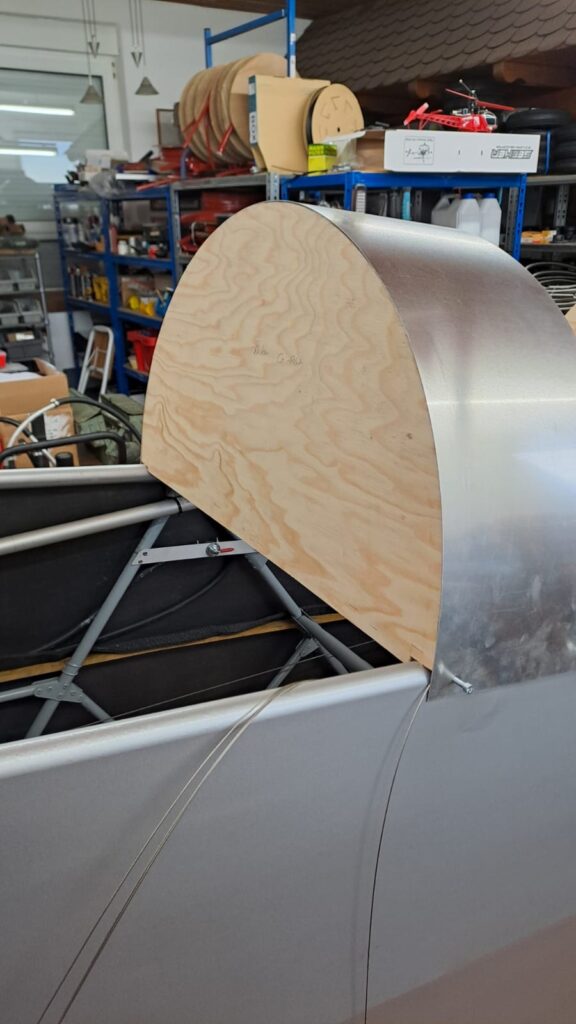 Das Rückteil des Piloten ist ebenfalls eine Holzplatte, durch die die Gurte hindurchgeführt werden und gleichzeitig die Klappe zum Gepäckfach. Die Platte ist zweiteilig aufgebaut und verbunden durch ein Klavierband-Scharnier. Oben hat Sascha noch ein Loch für ein Schloß gebohrt, damit man die Klappe abschließen kann. Da wir beide Teile getrennt beziehen mussten, entsteht eine unschöne „Naht“ an der Stelle des Klavierbands. Sascha hat also zuerst den Rahmen bezogen. In der Zeit habe ich das Kunstleder für die eigentliche Klappe zugeschnitten und daran eine Art „Lappen“ aus Kunstleder angenäht. Anschließend habe ich die Klappe dann mit dem Stück Kunstleder bezogen. Sascha hat dann das Klavierband montiert und ich habe den „Lappen“ auf der Rückseite festgetackert. Zum Schluss wurden die Gurtdurchführungen mit PVC Kleber aufgeklebt.