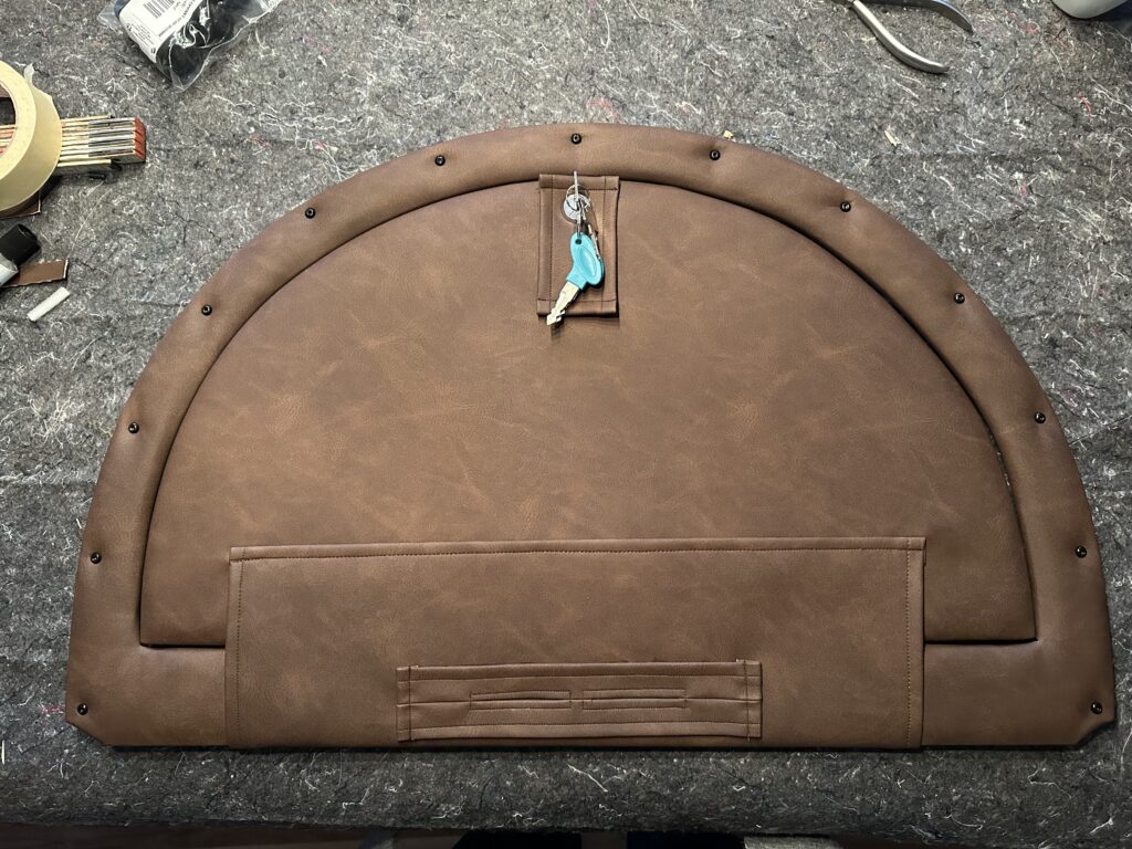 Das Rückteil des Copiloten ist eine Holzplatte, durch die die Gurte hindurchgeführt werden. Die Löcher für die Gurtdurchführungen haben wir mit Gummikabeldurchführungen verstärkt. Um das Rückteil später am Rumpf zu befestigen haben wir um die halbrunde Oberseite des Rückteils Bohrungen vorgenommen, die später mit kleinen Winkeln versehen werden. Die Blenden für die Gurtdurchführungen habe ich selbst genäht. Zuerst wurde die zugeschnittene Holzplatte mit Volumenvlies beklebt und danach mit Kunstleder bezogen. Nachdem die Holzplatte mit Kunstleder bezogen war, wurden die Blenden für die Gurtdurchführung mit PVC Kleber aufgeklebt.